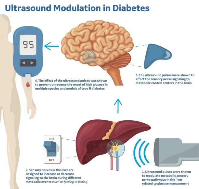 In three different preclinical models, a multi-institutional team led by Yale School of Medicine (YSM) demonstrated the ability to use ultrasound to stimulate specific neurometabolic pathways in the body treating diabetes without medication and to prevent or reverse the onset of type 2 diabetes. The findings were published in Nature Biomedical Engineering by the team, which included Raimund Herzog's, MD, MHS, lab at YSM.